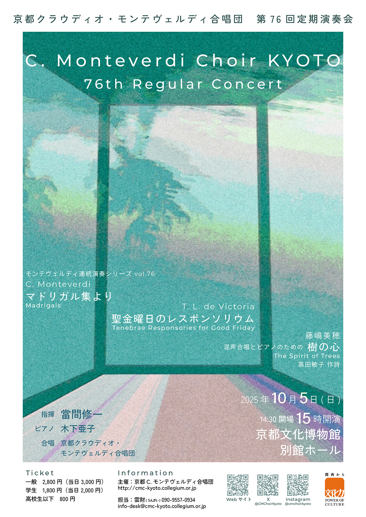 「京都クラウディオ ・モンテヴェルディ合唱団」が今求める音色と共に、その一端を味わって頂ければ嬉しく思います。